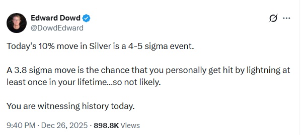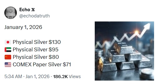 Comment: 26th Dec 2025 | Over $82 dollars in Shanghai which people in the know realise is the real price, not the fake paper swapping price at the Comex and LBMA. PLEASE NOTE: BETTING ON A COMMODITY IS NOT THE SAME AS OWNING THE COMMODITY AND MANY ARE GOING TO FIND THIS OUT WHEN THEY DEMAND SILVER THAT THEY THINK THEY HAVE BOUGHT. As previously explained, the paper to physical ratio is ~400-1. Yes that means that for 400 paper ounces, there is only 1 physical ounce. There is going to be a lot of disappointed investors who will soon find out that they have only been betting on the silver price.