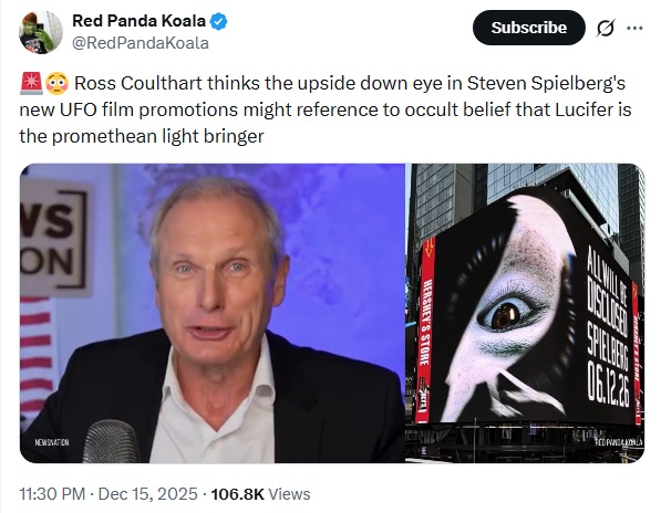 🚨😳 Ross Coulthart thinks the upside down eye in Steven Spielberg's new UFO film promotions might reference to occult belief that Lucifer is the promethean light bringer