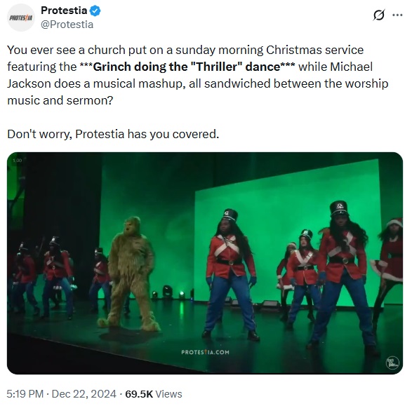 You ever see a church put on a sunday morning Christmas service featuring the ***Grinch doing the "Thriller" dance*** while Michael Jackson does a musical mashup, all sandwiched between the worship music and sermon?