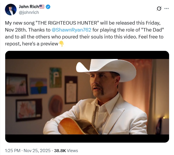 My new song "THE RIGHTEOUS HUNTER" will be released this Friday, Nov 28th. Thanks to @ShawnRyan762 for playing the role of "The Dad" and to all the others who poured their souls into this video. Feel free to repost, here's a preview👇