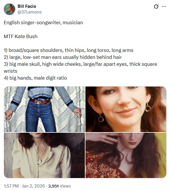 Comment: There are 8 images in this short thread about British singer Kate Bush, with many general MTF traits outlined for educational purposes. You can clearly see the 'man' appear as 'she' got older. In the last image she is hiding her wrists, many older celebs do the same.