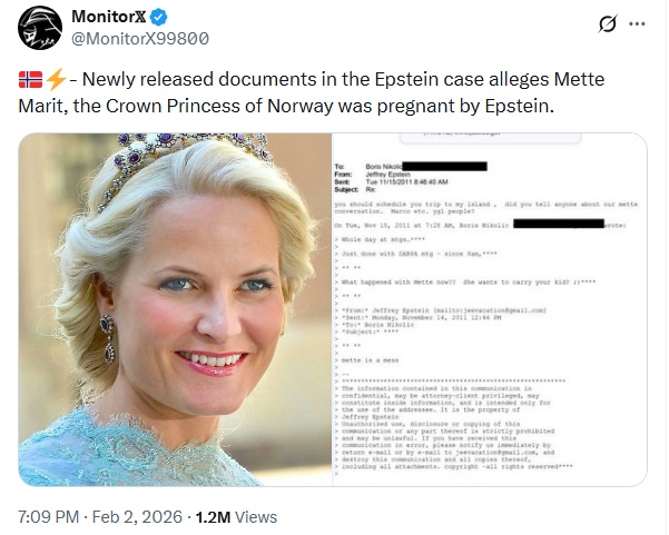 Comment: I thought this was a good summary of the Norwegian royalty scandal fueled by revelations from the Epstein Files. Future queen Mette-Marit's mutual Epstein friend Dr. Boris Nikolic described her as "twisted". I seriously don't think she can be trusted and I still think she is involved in some shady business. Her first born son is so off the rails that I wonder if he was sent off for mind control and his degenerate behaviour is the result. Either that or the drugs.... The thumbnail is from another video.