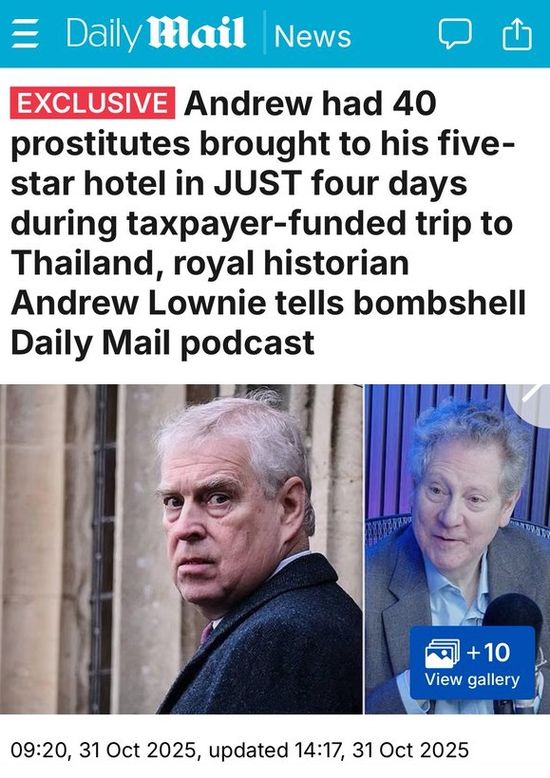 Speaking to Deep Dive: The Fall of the House of York, Lownie claims that during one taxpayer-funded trip to Thailand, the disgraced former prince had 40 prostitutes brought to his five-star hotel over just four days.
