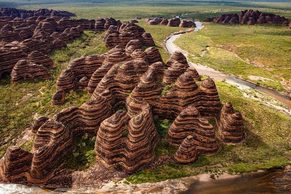 In the Kimberley region of Western Australia sits Purnululu National Park, a protected area of nearly 600,000 acres established as a park in 1987. Purnululu is home to the Bungle Bungle Range, featuring spectacular “beehive dome” karst sandstone formations—some rising more than 600 feet above the surrounding plains.
