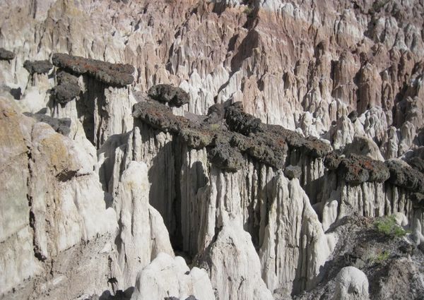 The Paint Mines in Colorado cover 750 acres and features geological formations of hoodoos, colored clay, and sandstone-capped spires. The colorful layers of the rock formations are caused by oxidized iron compounds. The Paint Mines are named for their colorful clays that were collected by American Indians to make paint.