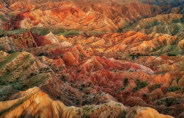 These are the famous Rainbow Mountains in Zhangye Danxia Landform Geological Park in northwest China. These red, yellow, green, blue, pink, and gray hills are the product of deposits of sandstone, iron, and other trace minerals.