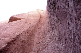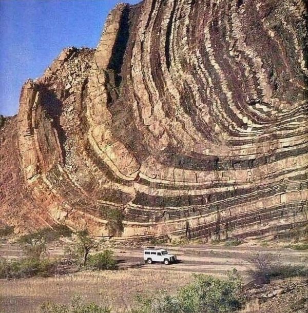 The experts call this a “fold.” We are told ...“this is a stack of originally planar surfaces, such as sedimentary strata, that have been bent or curved during a permanent deformation.” Lower Ugab River valley of Namibia.