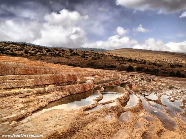 Badab Sourt is made of a range of stepped travertine terrace formations thousands of years ago, as flowing water from two hot mineral springs cooled and deposited carbonate minerals on the mountainside. The Badab Sourt Spring is actually comprised of two separate springs with completely different colored and scented water. The first spring contains very salty water that gathers in a small natural pool.During the summers locals swim in the pool and believe its water is useful for curing back aches, rheumatism and skin diseases. The second spring has a sour taste and is predominately orange mainly due to the large iron oxide sediments at its outlet.