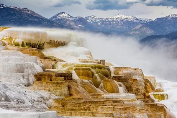 Yellowstone National Park’s Mammoth Hot Springs consist of travertine terraces formed by an abundance of geothermal vents.
