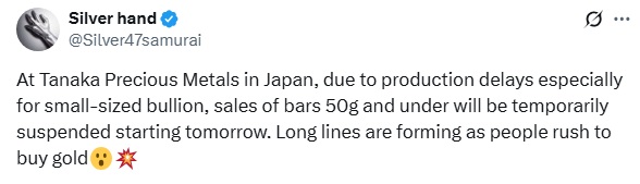 At Tanaka Precious Metals in Japan, due to production delays especially for small-sized bullion, sales of bars 50g and under will be temporarily suspended starting tomorrow. Long lines are forming as people rush to buy gold😮💥