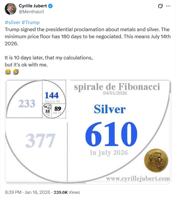 🔴 These 350,000 ounces I bought a month ago were all American Silver Eagles I bought at $57 + $1.50 premium are now listed on the US Mint site for $173. Up $40M. | XTwitter | 17 Jan 2026
