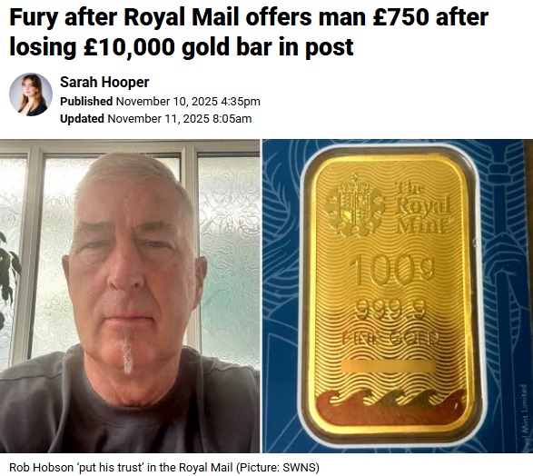 Fury after Royal Mail offers man £750 after losing £10,000 gold bar in post
