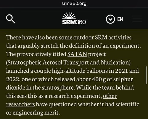 In 2025, the UK officially launched a geoengineering operation named SATAN (Stratospheric Aerosol Transport and Nucleation), injecting sulfur into the stratosphere to âdim the sun.â This is real. Under a name straight from hell, unelected technocrats are altering the climate, risking ecosystems, and threatening all life.