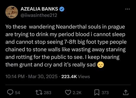 Comment: This post is dated 30 March 2025. There is no reason to believe that a black female rapper would lie about having nightmares after seeing neanderthals in Prague chained up for the public to see. Presumably, the most important people had already seen this spectacle and so when Azealia Banks turned up, it was the D list celebrities that were now being given this viewing opportunity.