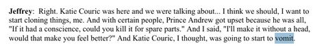 "Jeffrey: Right. Katie Couric was here and we were talking about... I think we should, I want to start cloning things, me. And with certain people, Prince Andrew got upset because he was all, "If it had a conscience, could you kill it for spare parts." And I said, "I'll make it without a head, would that make you feel better?" And Katie Couric, I thought, was going to start to vomit."
