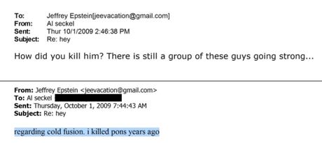 Then there is the DOJ document where Epstein boasted about supressing Cold Fusion research. In 2009, Epstein boasted: "I killed Pons years ago." That is Stanley Pons, the cold fusion researcher who made a discovery that could have given the world clean, limitless energy using water.