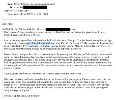 Seckel is complaining that gate-keeping science is getting harder and harder (too bad...) The event at the Kodak Theater seems to be about getting members of the media elite straight about what to think and therefore what to censor. Presumably, Seckel wanted Epstein to know how well his thought crime policing was doing.... Again mention of stopping big investment in free energy devices.