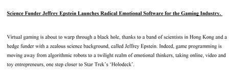 Science Funder Jeffrey Epstein Launches Radical Emotional Software For The Gaming Industry |