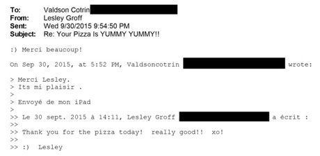 6. And someone whose name is redacted, but is almost certainly Fisch, as he is sending an attached document from “Veru-Equity” which is Fisch’s company, appears to make clear that he is using a coded phrase when he writes, in an email to Epstein,” Let’s go for pizza and grape soda again. No one else can understand.” | Link