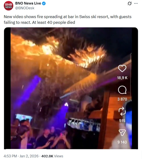 New video shows fire spreading at bar in Swiss ski resort, with guests failing to react. At least 40 people died