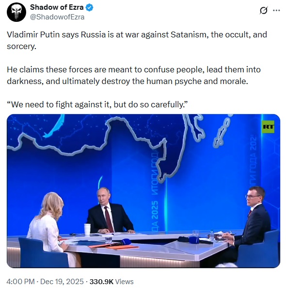 Vladimir Putin says Russia is at war against Satanism, the occult, and sorcery.