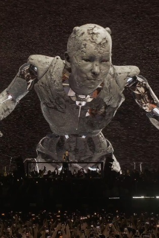 Comment: Note the horn stubs on the head.... I don't agree with the claim that "hundred thousand people are worshipping a 200 ft tall robot in front of the pyramids", I believe that is going too far....