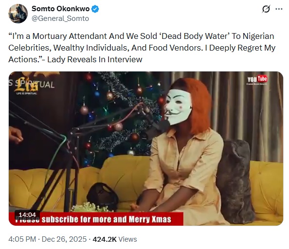 “I’m a Mortuary Attendant And We Sold ‘Dead Body Water’ To Nigerian Celebrities, Wealthy Individuals, And Food Vendors. I Deeply Regret My Actions.”- Lady Reveals In Interview
