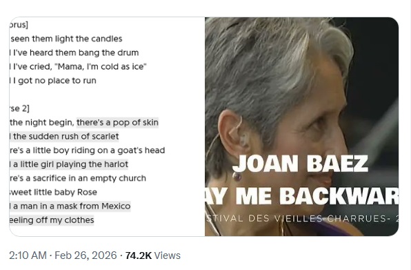 Bob Dylan's ex Joan Baez's song "Play Me Backwards" (released by Richard Branson-founded Virgin Records) is literally about Satanic child sacrifice. (H/t @DimensionsODust)