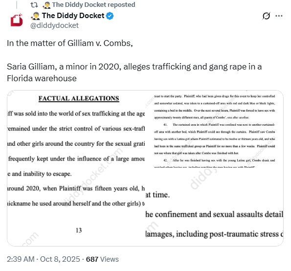 [Update 23/12/24: I don't have time to go through all the Diddy lawsuits (many links can be found on XTwitter @DocumenTingz, link, but this lawsuit is for a male actor that went to an audition for a a role playing a police officer in a music video John Doe vs Sean Combs+ | Case 1:24-cv-08812 | Document 1 | Filed 11/19/24.]