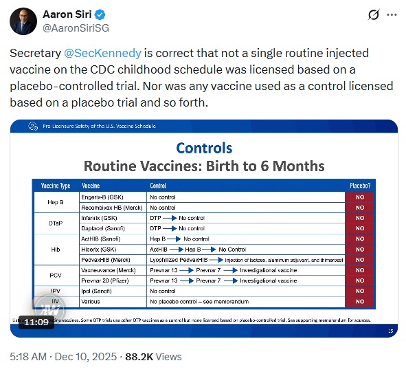is correct that not a single routine injected vaccine on the CDC childhood schedule was licensed based on a placebo-controlled trial. Nor was any vaccine used as a control licensed based on a placebo trial and so forth.