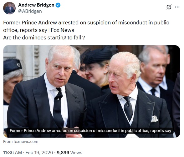 Comment: It's being reported that Andrew was arrested on his 66th birthday! Even I think that is some serious COMMS! Link. Here is the statement from Buckingham Palace