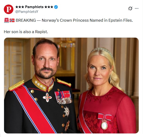 🚨🇳🇴 BREAKING — Norway’s Crown Princess Named in Epstein Files.