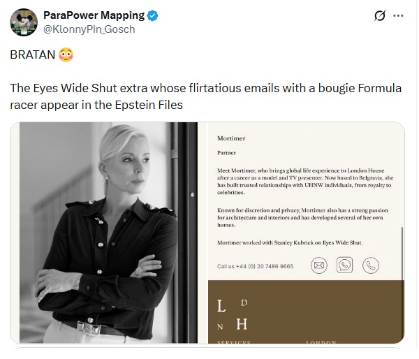 The Eyes Wide Shut extra whose flirtatious emails with a bougie Formula racer Mortimer appear in the Epstein Files