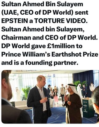 Sultan Ahmed bin Sulayem is famed for sending Epstein a torture video. In reply Epstein stated, "I loved the torture video." Bin Sulayem has resigned as CEO of "DP World" a cargo container company in the UAE and has now been arrested Link.