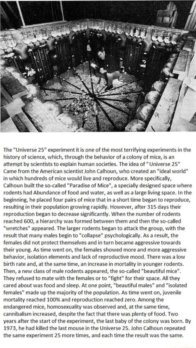 Commemt: Posts about the Universe 25 Mice experiments conducted in the 1950s-1970s, are spreading across social media. This summary is just about adequate, despite being posted by the President of El Salvador. See more details in the following video: