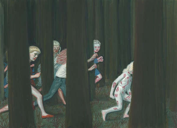 This painting was used for the illustrated book “Resta Con Me” (Stay With Me). It is pure Monarch symbolism. The checkerboard floor represents the ritualistic surface of occult transformation. The red dress represents the color of sacrifice. The masks represent the selection of alters (available personalities that can be switched to with the right command) of an MK slave.