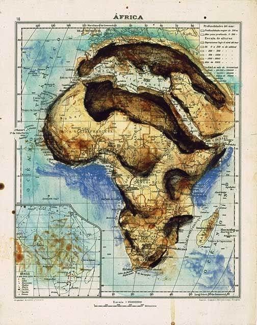 Comment: This artist has taken pareidolia to new levels.... However, the 5 images of Africa are interesting. Is it plausible that Africa is really the remains of a titan skull? Please note the map of Japan which is rendered as some kind of bird like creature.