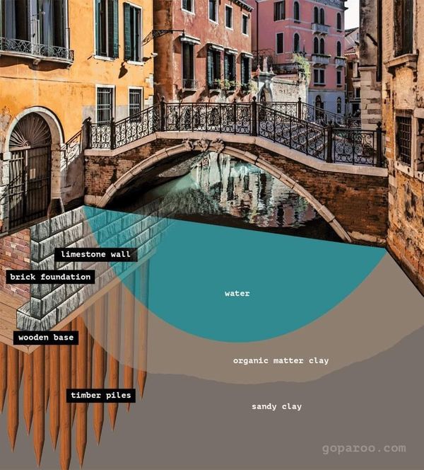 Venice is one of the world’s greatest cities built on small patches of marshland in a shallow lagoon. Tradition holds that Venice was founded on March 25, 421 AD and was built on a foundation of about 10 million logs. That’s 8-10 logs per square meter. Those logs were hammered into mud and due to the mud and salt water, the logs petrified. 1,600 years later, these same trunks of wood still support almost the entire central part of Venice. As the wood is completely submerged in water and mud, microorganisms that decompose wood die because they are deprived of oxygen. Therefore, the wood does not rot due to the anoxic environment (devoid of oxygen). The petrification process started due to minerals in the mud and salt penetrating the wood piles making them harder and increasing their longevity and resistance to decomposition. The mud still acts to form a protective layer around the piles, further isolating them from oxygen and microorganisms.