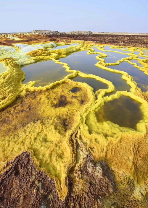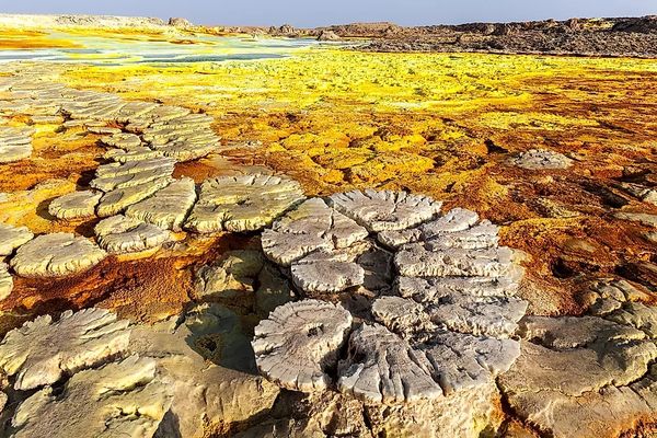 The Danakil Desert is expansive, hot, and arid, but that’s part of what makes the terrain so surreal. Spanning parts of Ethiopia, Eritrea, and Djibouti, this giant desert stretches over 50,000 miles and includes the iconic Danakil Depression, a destination with temperatures that jump to over 122 degrees Fahrenheit, making it one of the hottest places on Earth. The unique landscape is home to volcanoes, geysers, salt plains, and geothermal springs, which add pops of bright yellows, blues, greens, and oranges to the terrain.