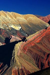 These are the famous Rainbow Mountains in Zhangye Danxia Landform Geological Park in northwest China. These red, yellow, green, blue, pink, and gray hills are the product of deposits of sandstone, iron, and other trace minerals.