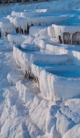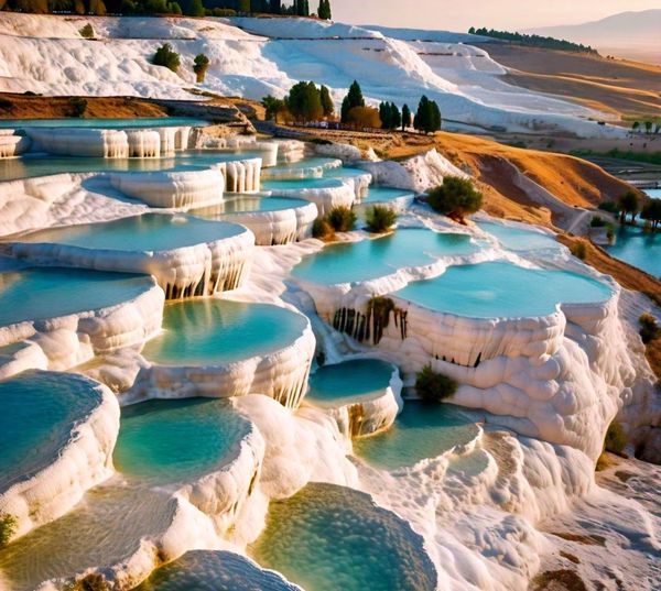 Pamukkale, Turkey, is renowned for its dazzling white travertine terraces, formed by mineral-rich thermal waters cascading down the mountainside. Pamukkale, means “cotton castle” in Turkish. The terraces are made of travertine, a sedimentary rock deposited by mineral water from the hot springs.