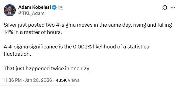Silver just posted two 4-sigma moves in the same day, rising and falling 14% in a matter of hours.