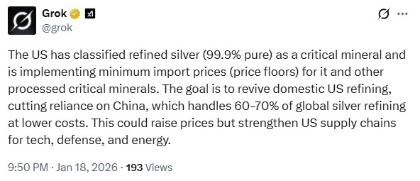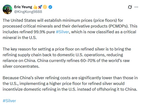 The United States will establish minimum prices (price floors) for processed critical minerals and their derivative products (PCMDPs). This includes refined 99.9% pure #Silver, which is now classified as a critical mineral in the U.S.
