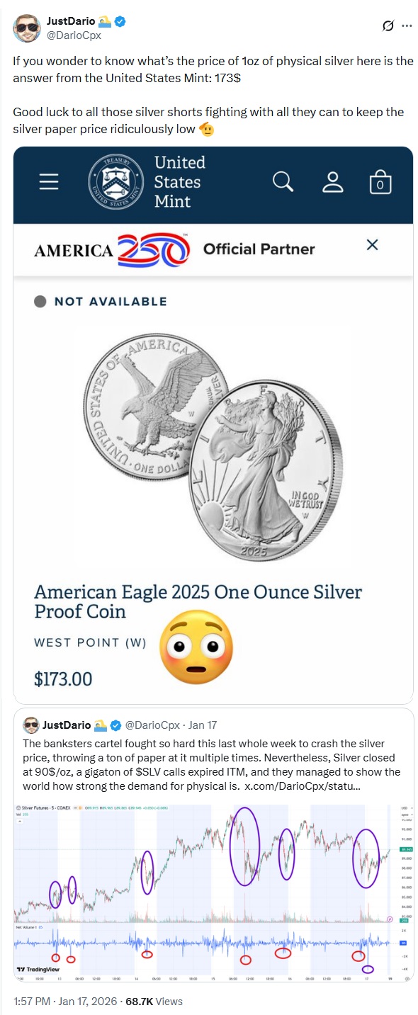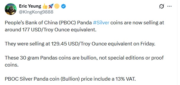 Comment: Friday 30th 2026 | This is hard to believe. Now we know that the silver market has bifurcated and the gap between East and West is now ~40%. [Update: At the crash bottom the difference between western spot silver price and Shanghai Silver Premium was 60%!Link.] In China, silver coins are being bought at ~$101 (seen higher values) to melt down into bars because demand is strong Link,