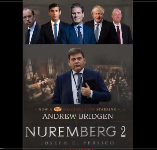 Comment: Hmmmm.... Andrew Bridgen has posted a meme video of him smiling with thumbs up in a Nuremberg style court, with Matt Hancock, Rishi Sunak, Keir Starmer, Boris Johnson and Chris Witty all in prison Orange Jumpsuits, all pleading as they face trial at Nuremberg, with Bridgen saying on the header…’Coming soon - Nuremberg 2. The trial to end all trials’….
