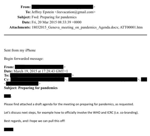 🚨In March 2015, years before COVID-19 entered the public lexicon, a draft agenda circulated for a Geneva meeting on “preparing for pandemics.” The correspondence discussed formally involving—and co-branding with—the World Health Organization and the International Committee of the Red Cross. Notably, the materials were forwarded to Jeffrey Epstein, a private financier with no public health, scientific, or humanitarian mandate.