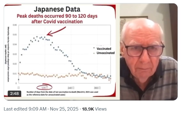 - Shocking data presented by Professor Yasufumi Murakami of Tokyo Science University showing a peak in deaths 90–120 days post-vaccination, with earlier peaks for higher doses, suggesting cumulative toxicity.