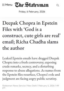 Comment: Some people are not surprised that Deepak Chopra was in the Epstein Files. I have not come across these allegations before, but there again, I was not looking. Many people have been truly disappointed. Here is the Chopra apology link
