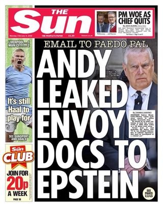 Ex-Prince Andrew on the front page of The Sun tabloid.