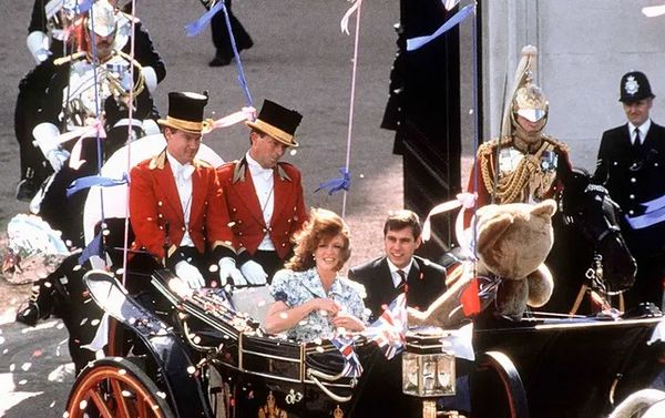 Prince Andrew and Sarah Ferguson leave for their honeymoon with a teddy bear in 1986.